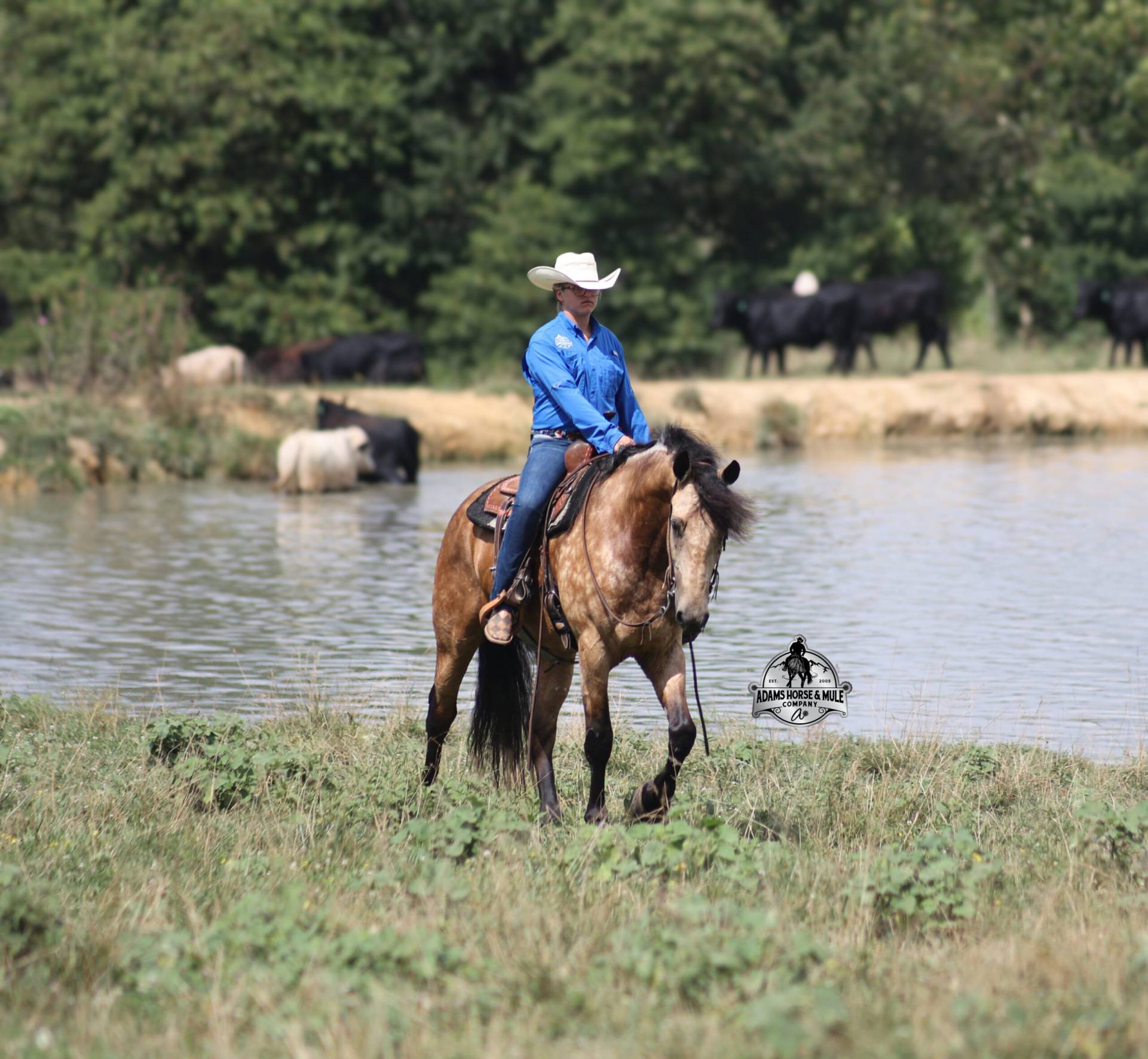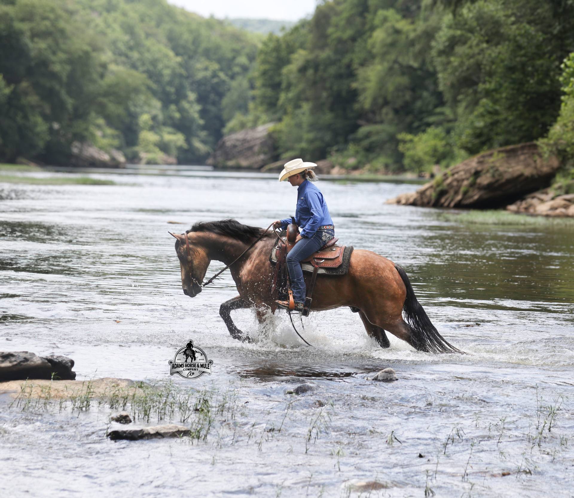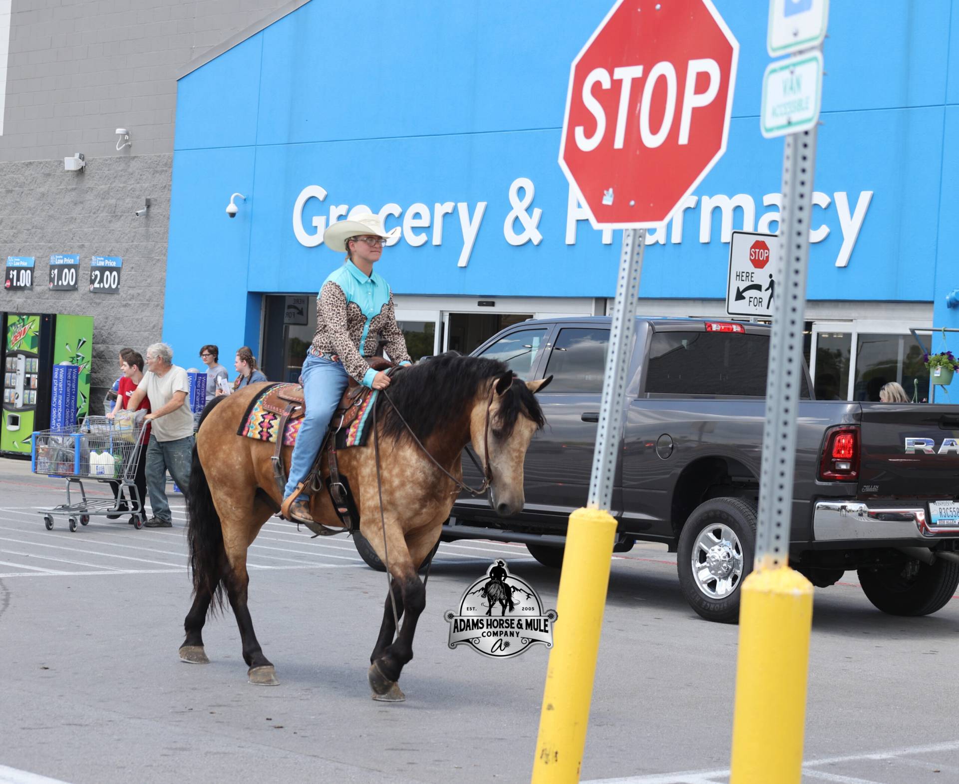 Ariat has been ridden down the highways, we have had in town and even though the bank drive-thru and he is traffic safe. He is a nice mover as he has a smooth trot, a VERY VERY nice easy to set lope, a good stop, turns a circle both ways and backs with ease! Ariat is great on trails and he will cross creeks, ditches, logs and navigate rough rocky areas. He has been exposed to all kinds of wildlife such as deer or turkey and will go anywhere that he is asked too.