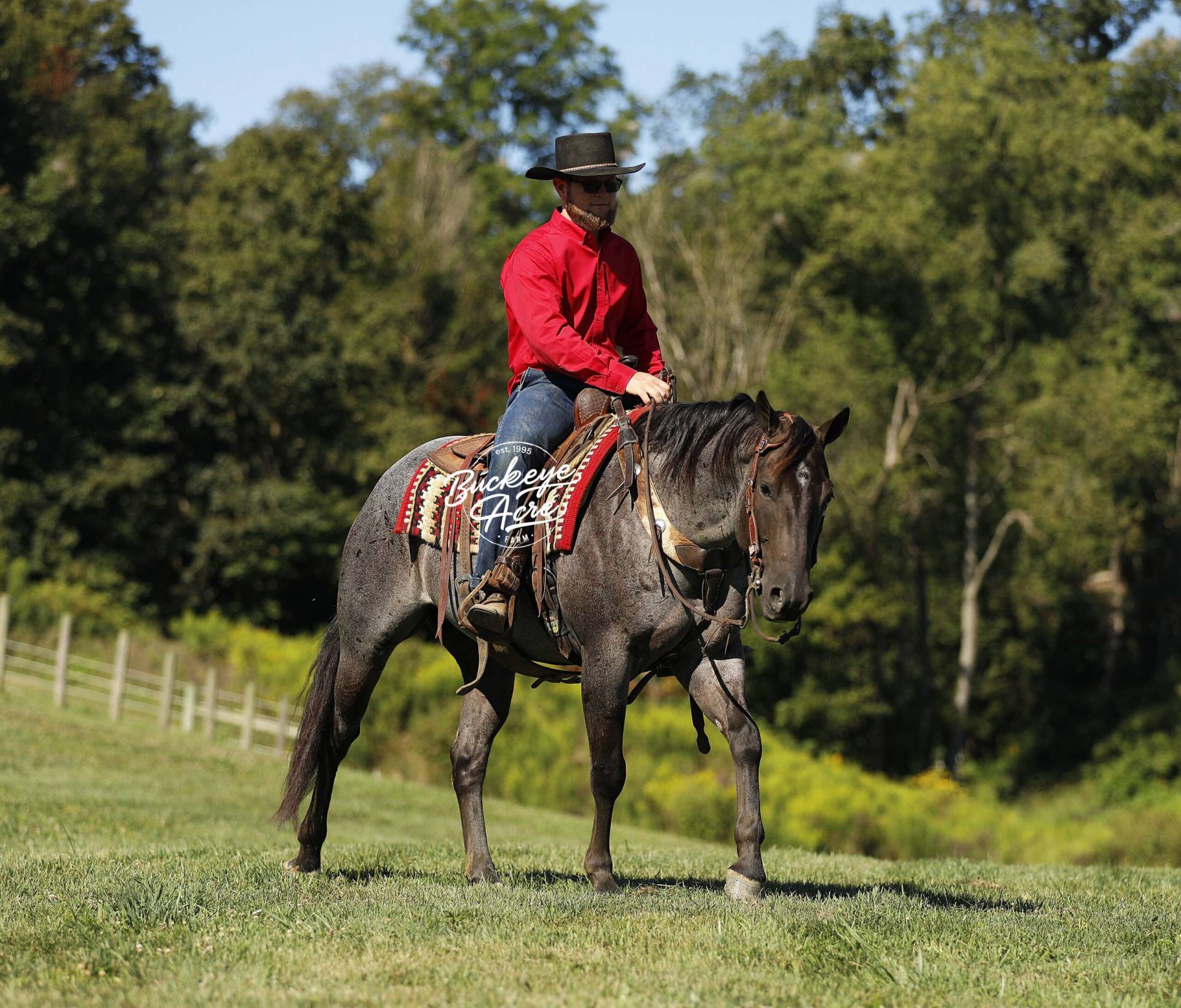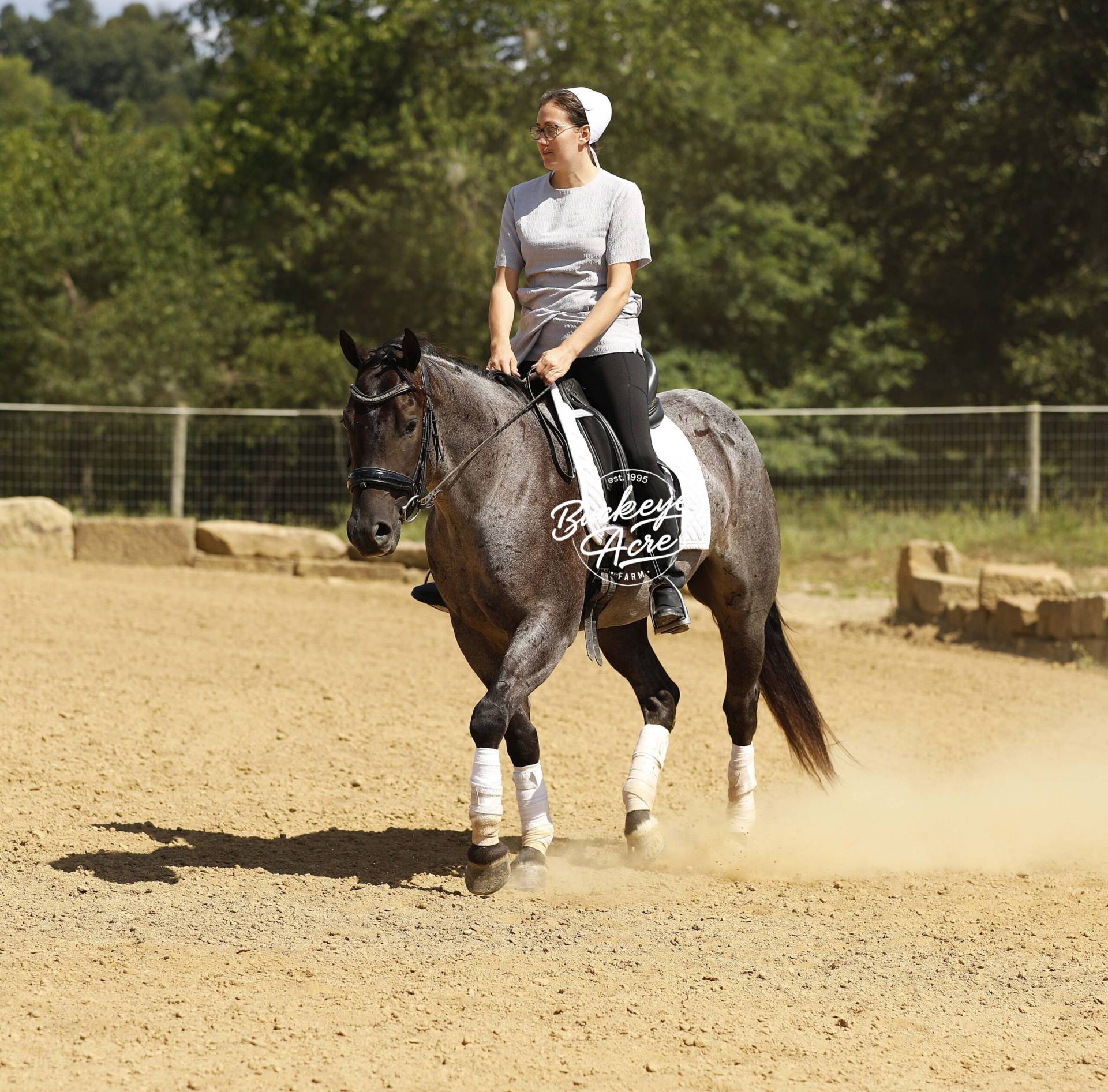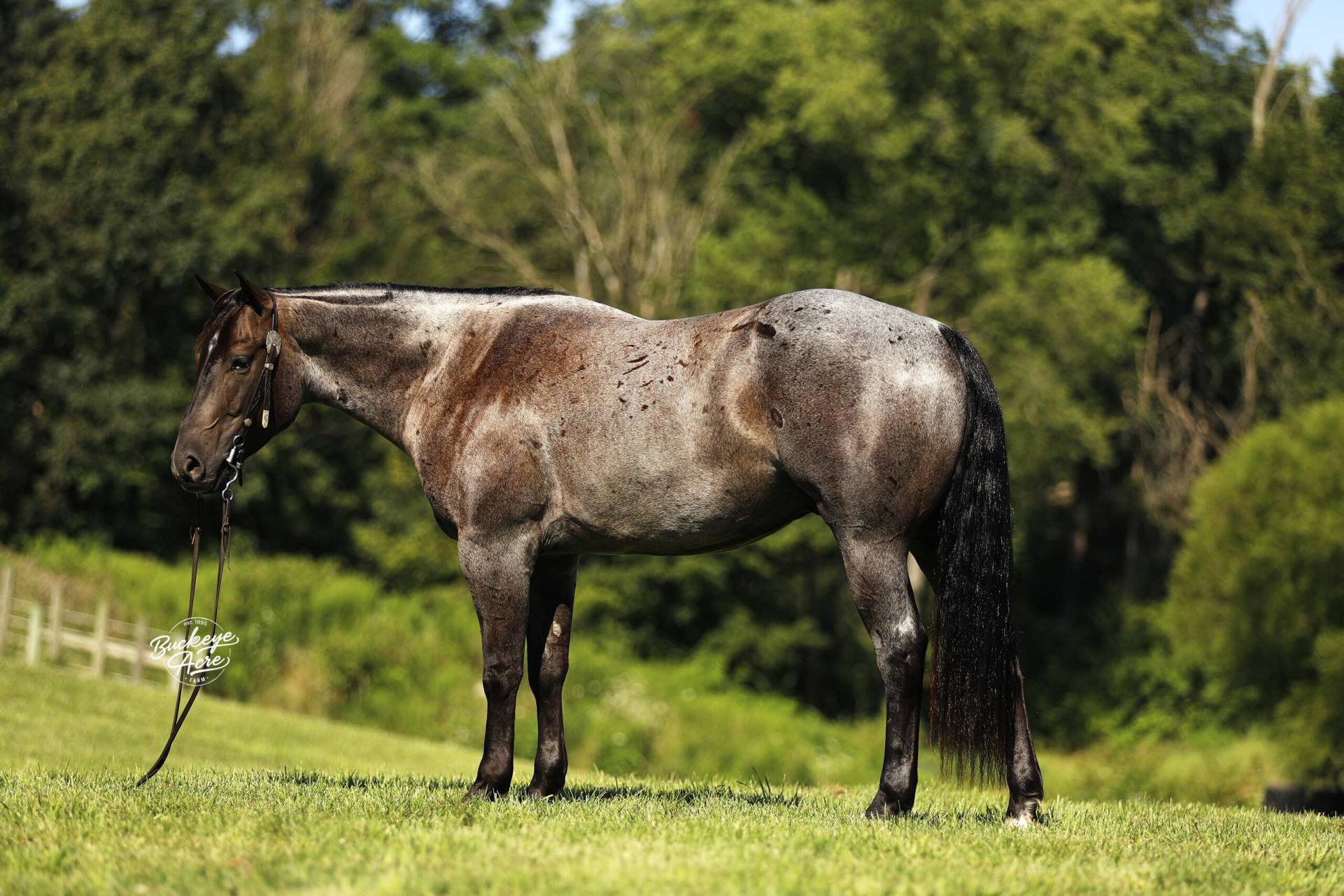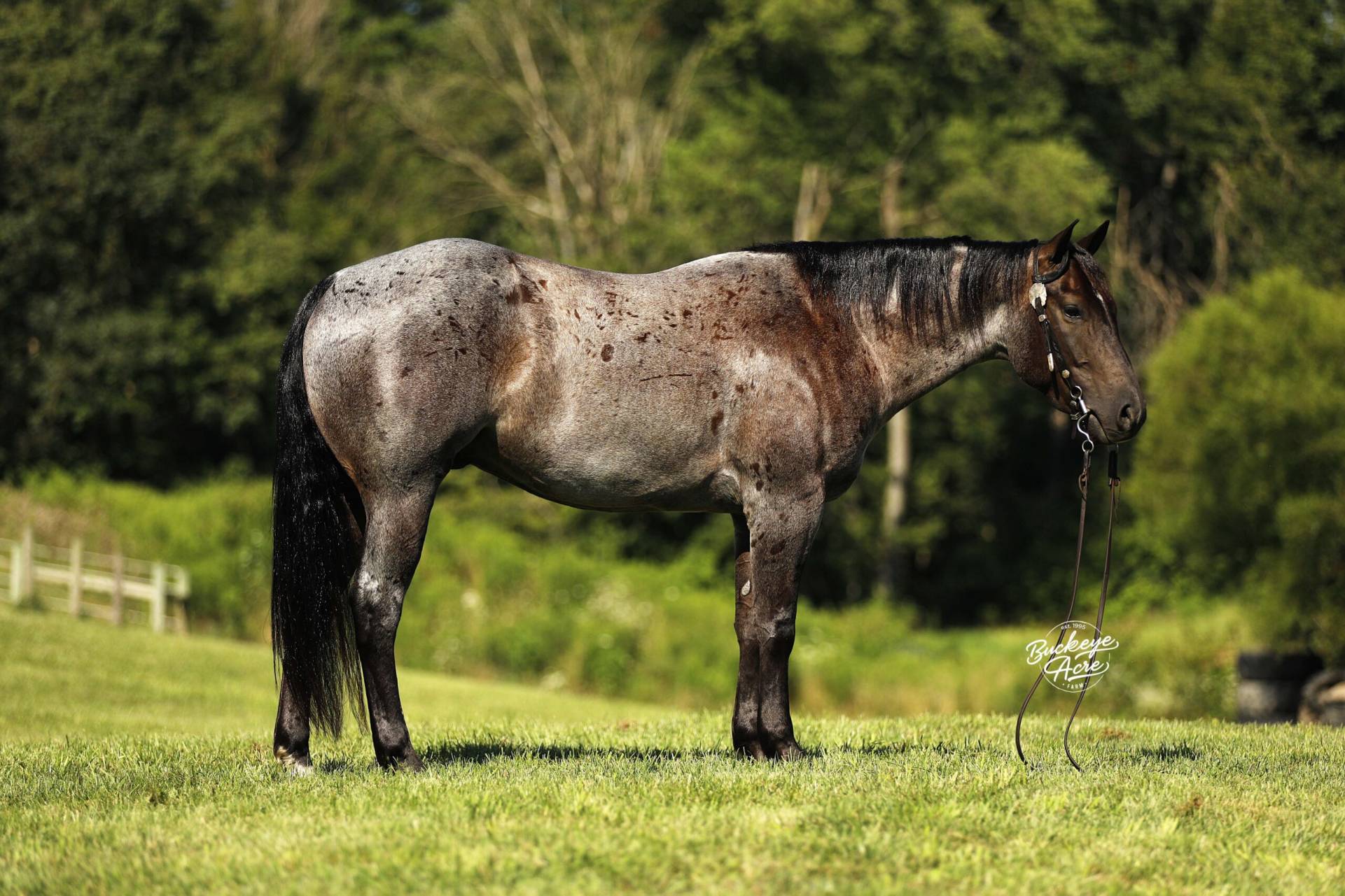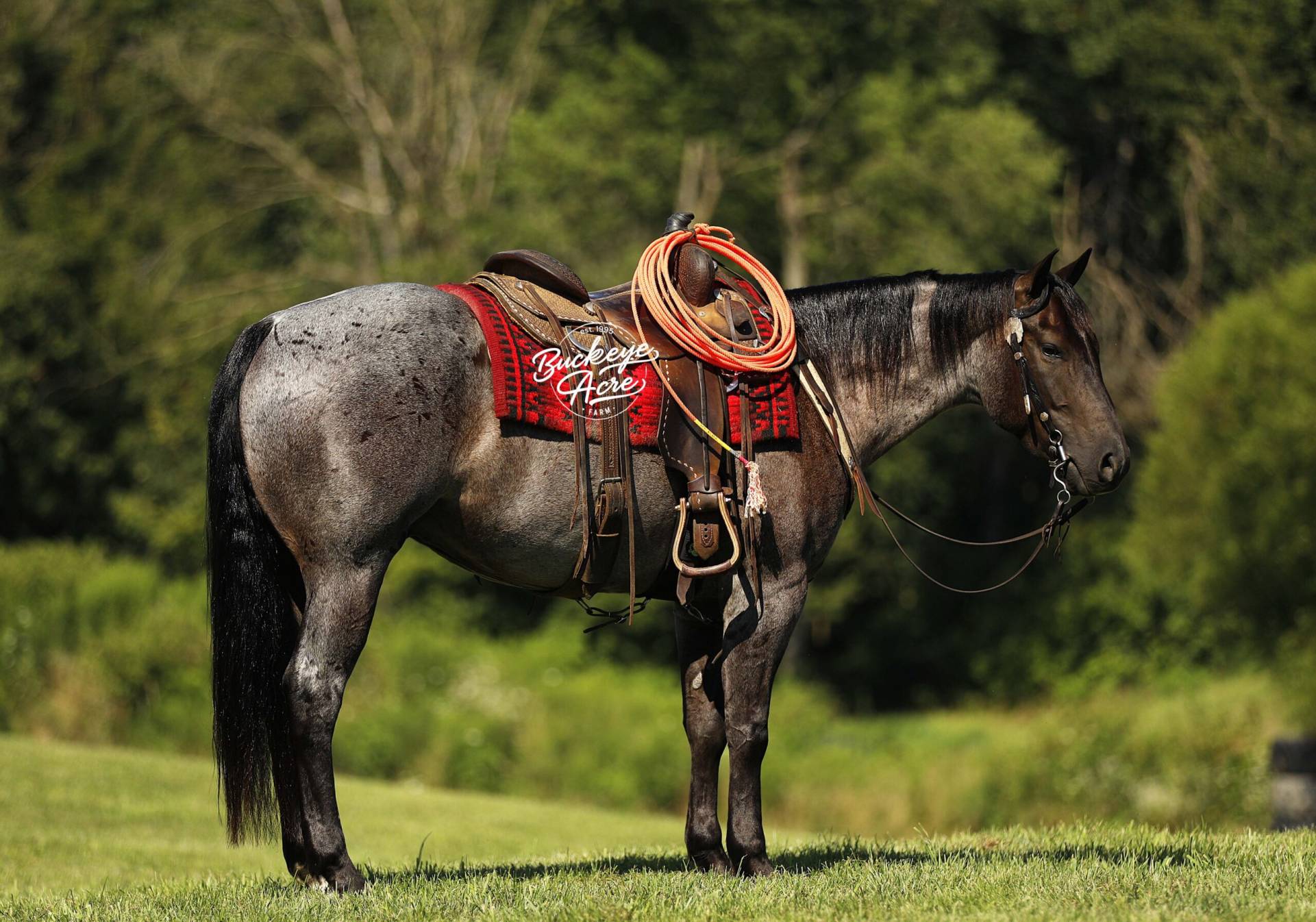 Laddy is a stunning blue roan gelding. With his striking coat, a soft white star on his forehead, and two small white socks on his hind feet, he is the kind that turns heads wherever he goes.