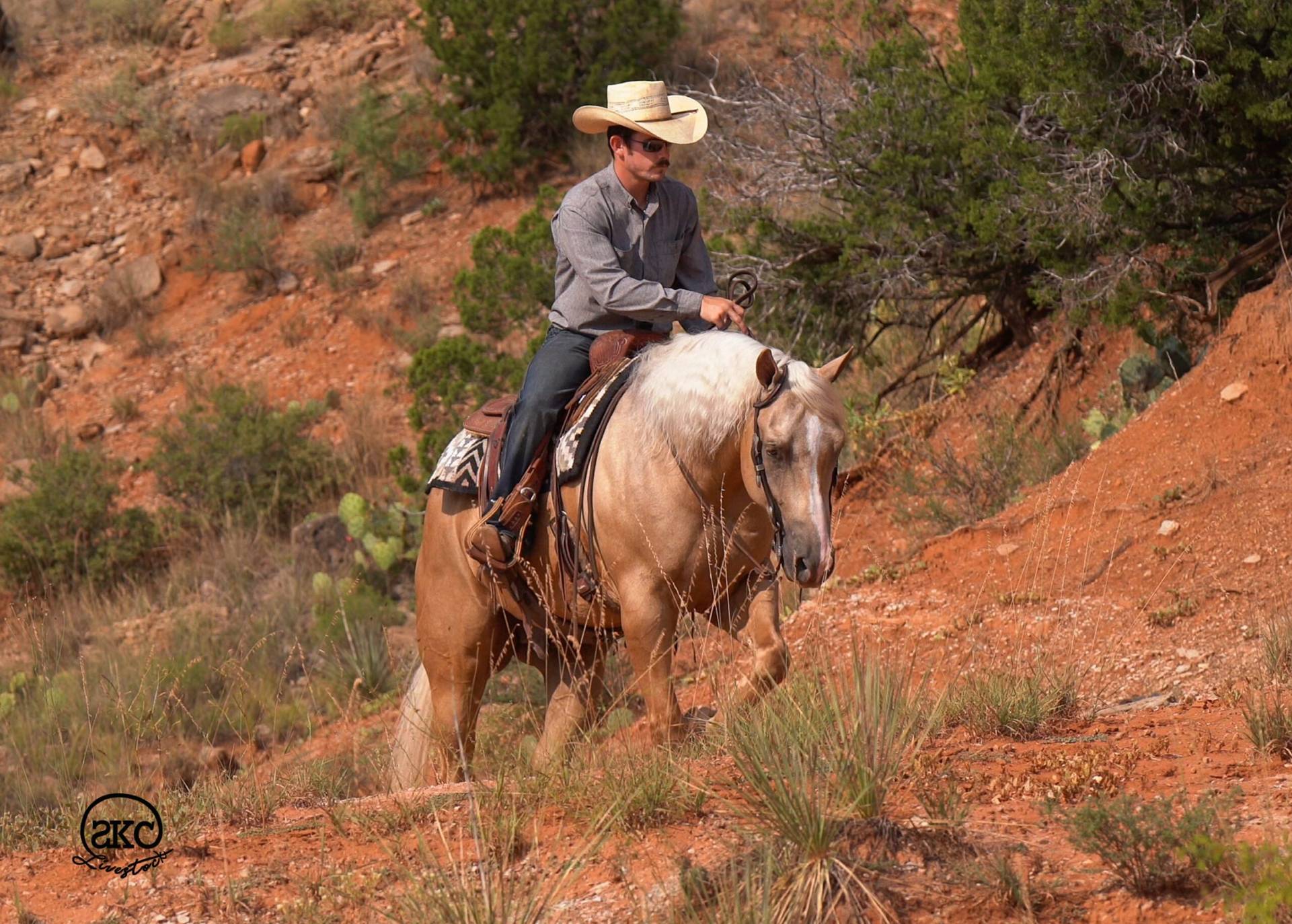 Mango has been used on the ranch and has plenty of outside miles. He’s worked in the feedlot, sorted and doctored cattle, and has been part of multiple brandings in the fall. He’s quiet in the herd, soft in the bridle, and stays gentle through long days. Mango has also been trail ridden through Palo Duro Canyon and along the Canadian River, crossing water, brush, and rugged terrain with ease. He’s confident around wildlife—deer, antelope, pheasants—and doesn’t get rattled. Mango is quiet on the ground, easy to handle, and has been safe for our younger riders. He’s the kind of gelding that fits a variety of riders and jobs—steady, capable, and always dependable.