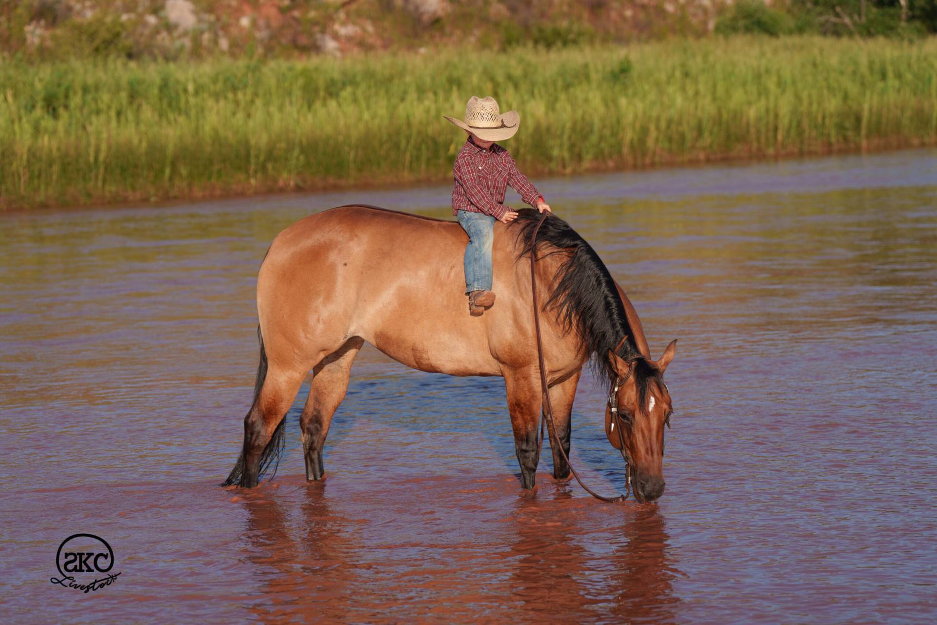 Whether you’re a youth rider, beginner, or just want something you can always trust, Sopapilla fits the bill. She’s a finished, solid ranch horse who knows her job and never misses a beat. She’s packed our four-year-old son out on early mornings with no issues, and our eight-year-old daughter has ridden her English, carried the flag in grand entries, and pushed countless calves out of the arena during rodeos. As well as shown her in ranch riding, reining and ranch trail.